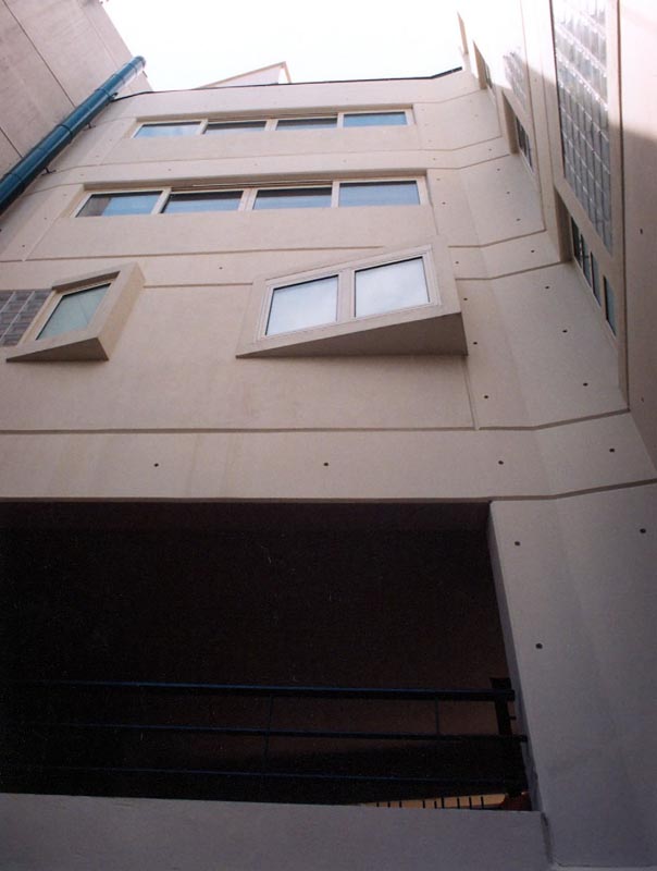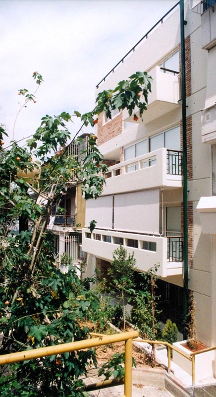 Each housing complex comprises, apart from the individual residences, schools,